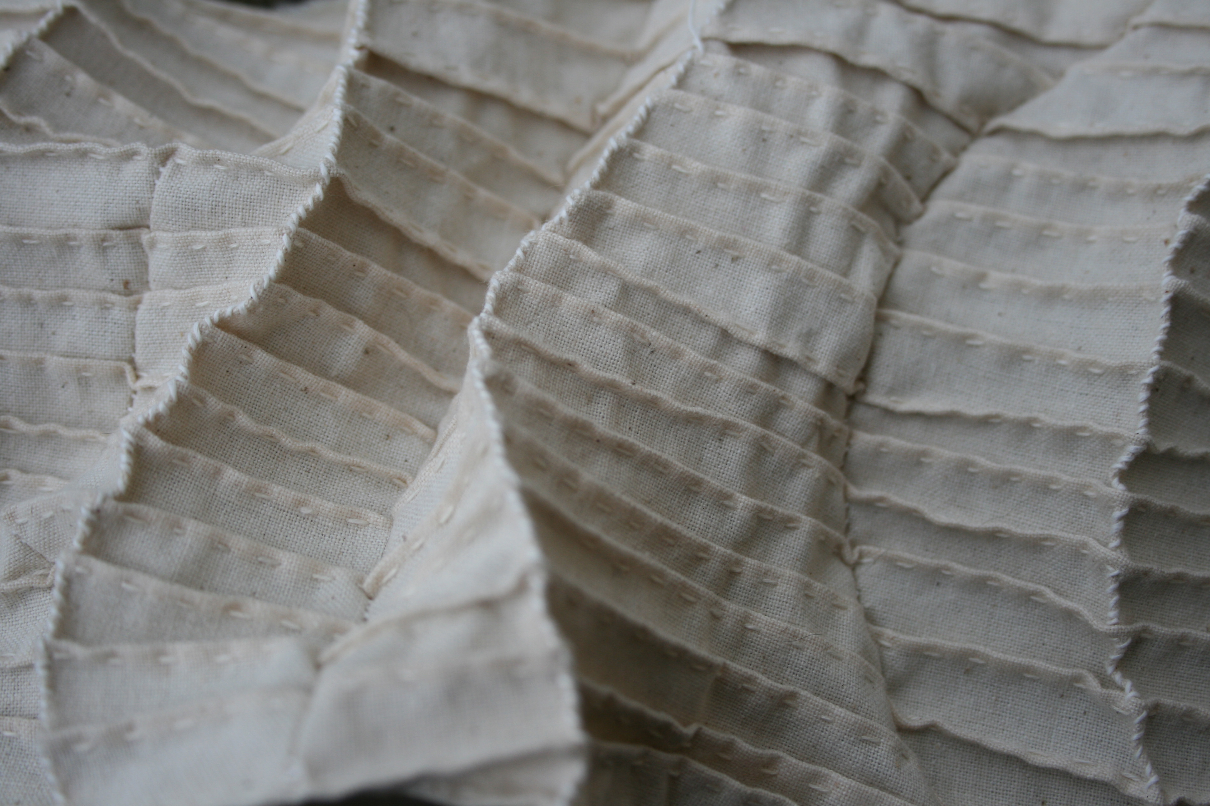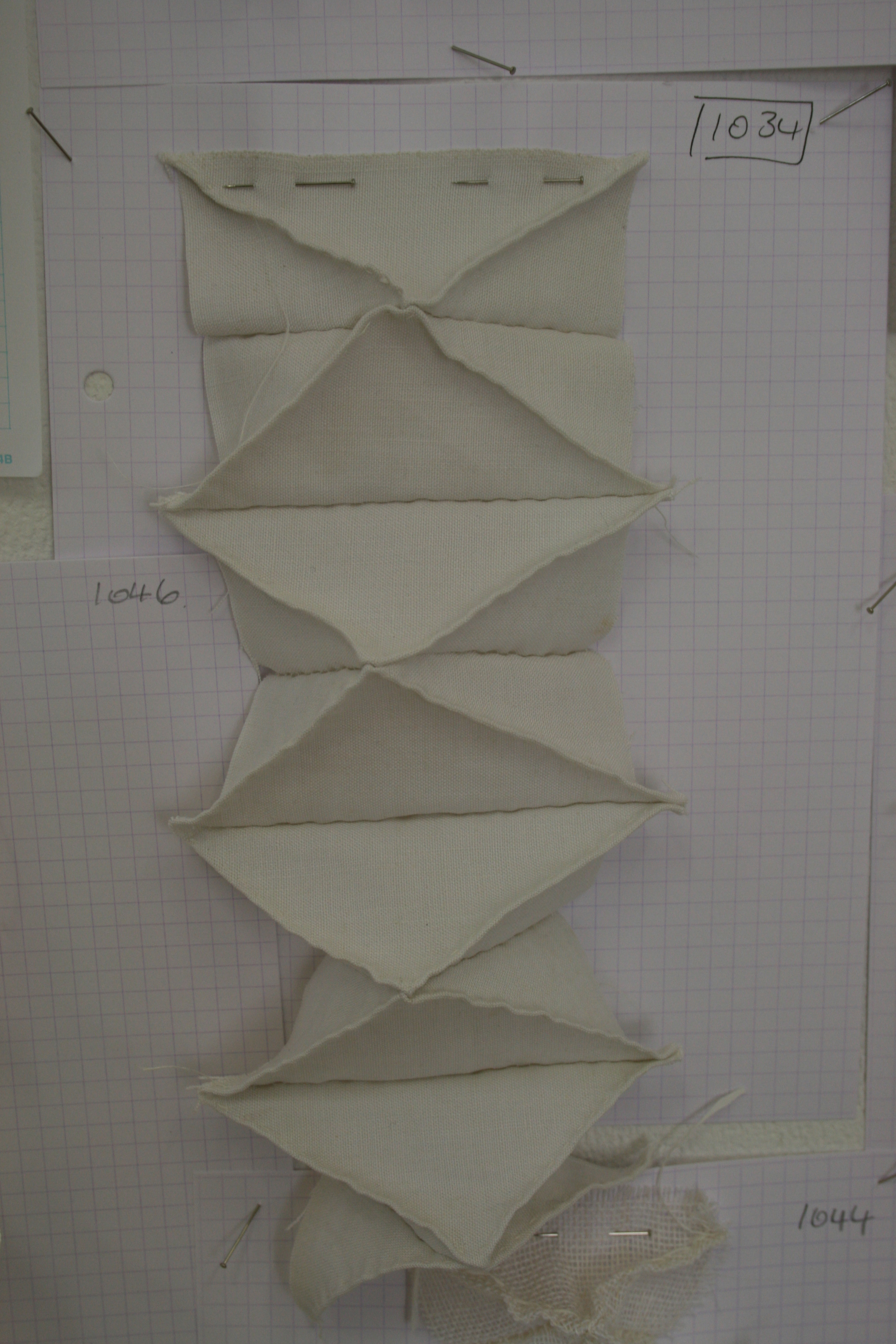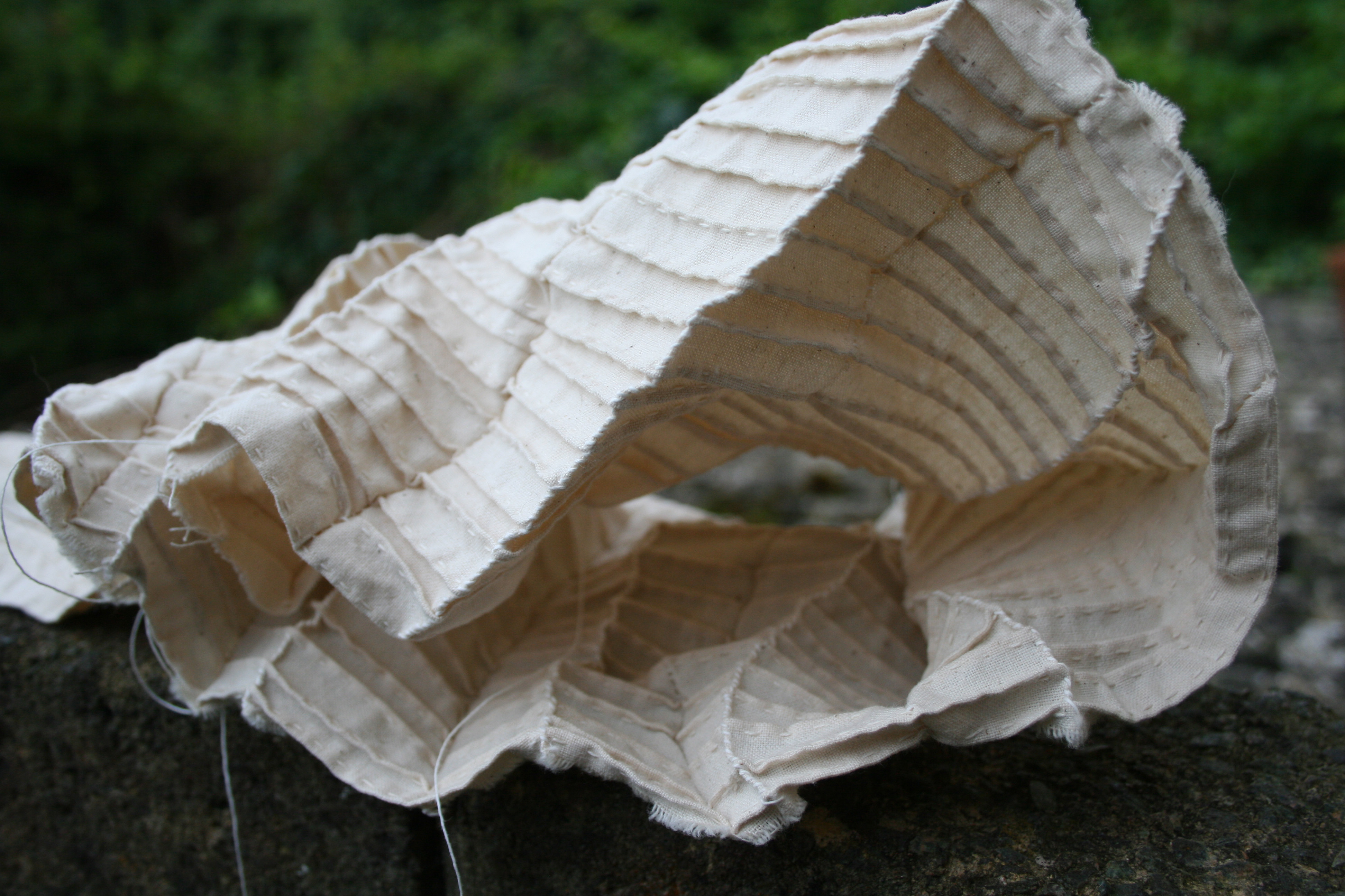 This is my first post and I am finding my way around the dashboard. My current work is involved in ‘cloth’ and how it might be joined to itself to cause a variety of animated surfaces. This cloth is a mixture of linen and cotton and holds the crease very well – considering that this started as a flat piece of cloth I am excited by the way it moves now.