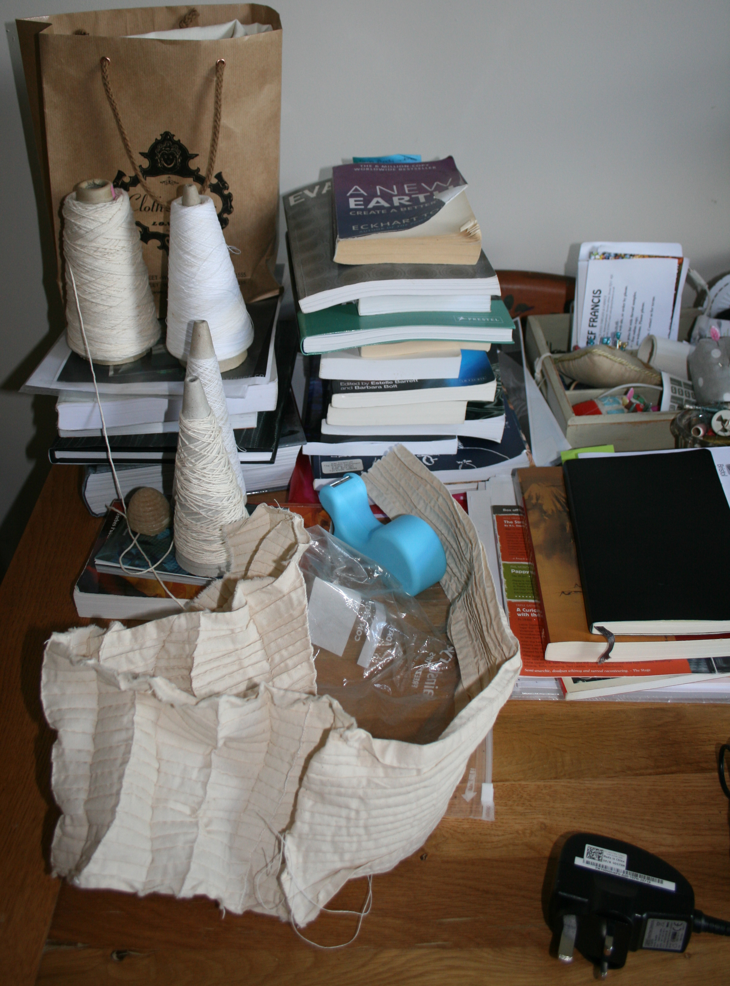 I have decided to adopt the challenge of the writer Julia Cameron of ‘morning writings’ and during this mornings musings I noticed that the table I work on in one corner talked about all that my work relates to in one small glimpse. The pile of books, the cones of thread, a cloth house carrier bag a stitched piece of ongoing work with the needle still working it.