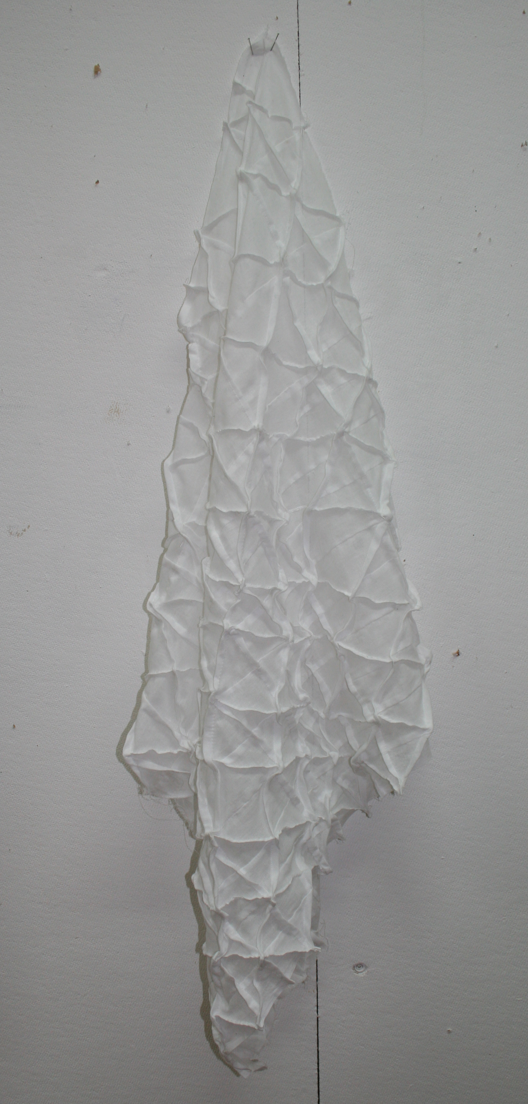This is a new piece that combines hand and machine stitch. The folds and therefore the seams made are very different in their finish but can bring something to each other. The solid – flat – squashed machine stiched seams contrast to the continual movement and expressive quality of the hand stitch seam, manipulated on a continual basis as the linear arrangement is made.