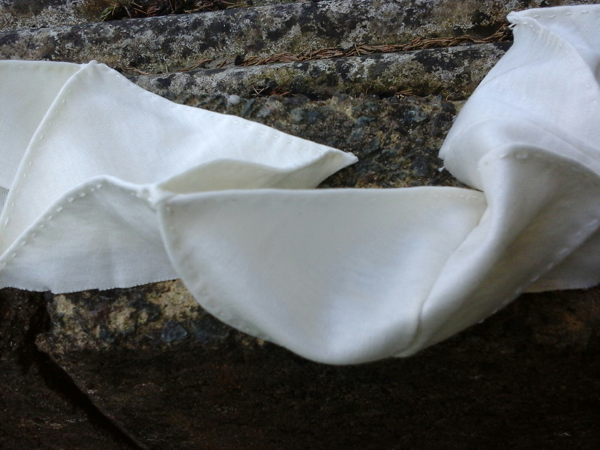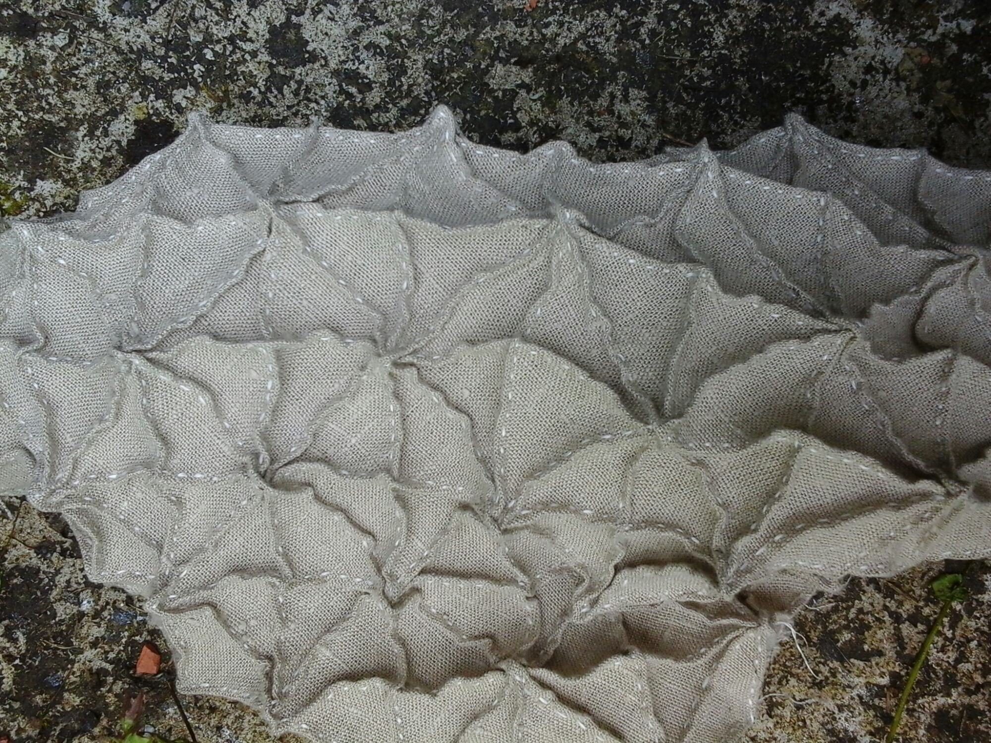 Whilst I was working on the sample below I realised that the union between thread and cloth is demonstrated through the individual natures of the elements and the coming together of both. The quite coarse linen is softened by the quality of the silky bamboo thread; difficult to work as the thread is shredded by the linen resisting the thread being pulled through the cloth. The warp and weft of the linen cloth make a large contribution to the visual outcome of the sample. The patterning forced to cross over the strength of the warp and weft. The bamboo thread is produced for weaving so gains its strength in the warp and weft alliance when woven. None of the often experienced meditative quality of stitching is experienced in this sample as there is often a ‘tug’ going on to manipulate the cloth and thread into the devised pattern.